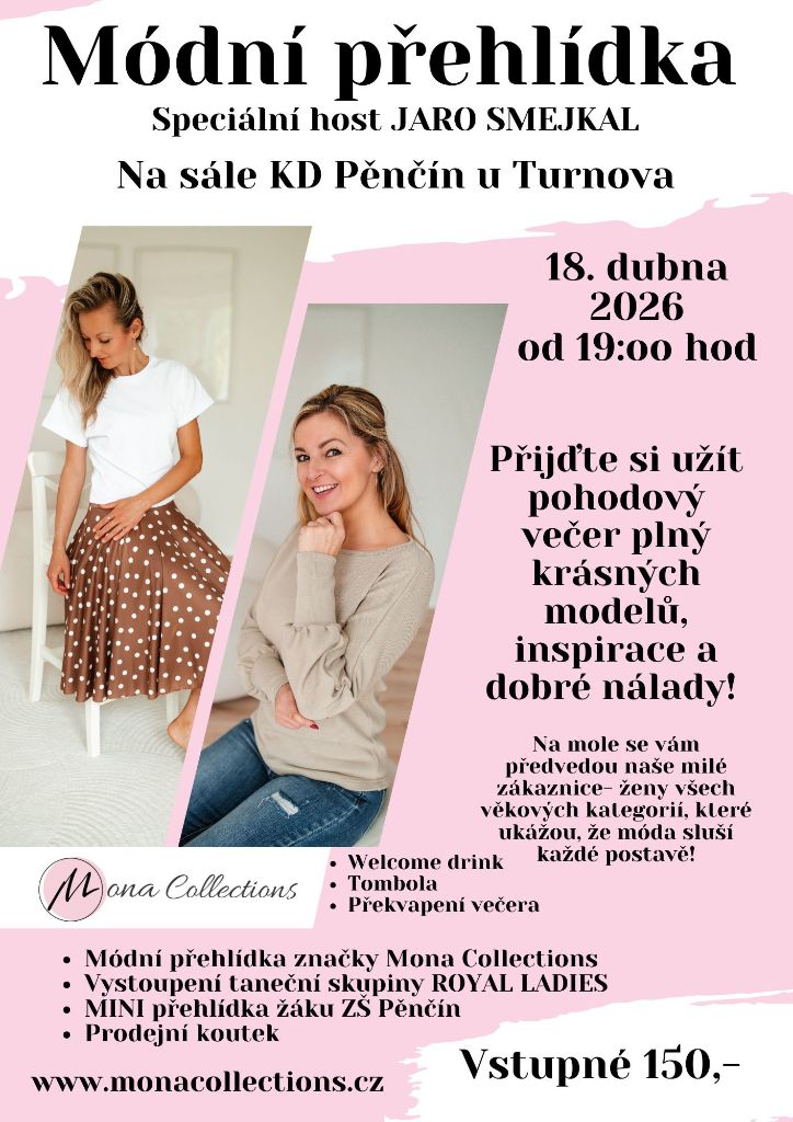 Pěnčín u Turnova, 18. dubna 2026 – Značka Mona Collections srdečně zve všechny milovníky módy, stylu a dobré nálady na jedinečnou módní přehlídku, která se uskuteční v sobotu 18. dubna 2026 v KD Pěnčín u Turnova. Večer slibuje nejen přehlídku nejnovějších trendů, ale i bohatý doprovodný program a vzácného hudebního hosta.